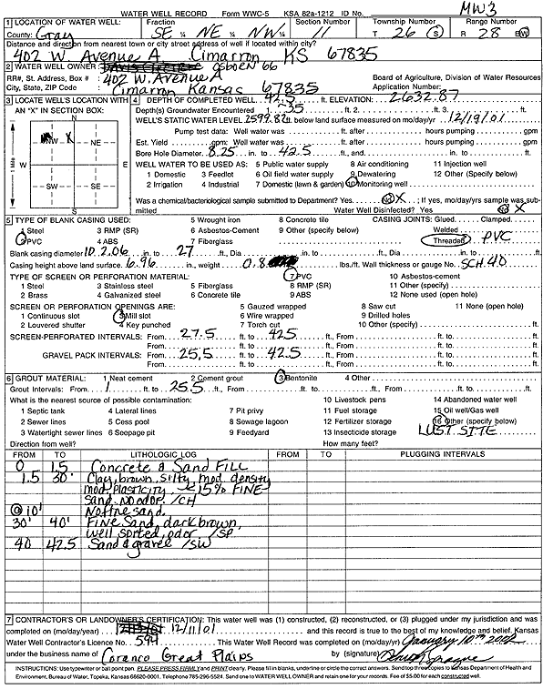 Osborn 66 | 42.5 ft. | 33.05 ft. | Monitoring well/observation/piezometer | MW 3 | Constructed | 11-Dec-2001 | Scan | |