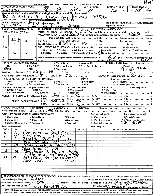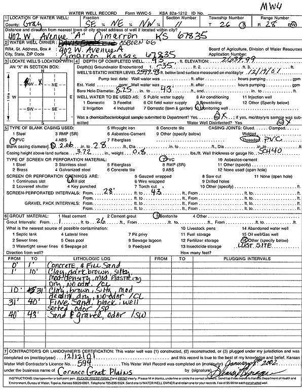 Osborn 66 | 43 ft. | 35.06 ft. | Monitoring well/observation/piezometer | MW 4 | Constructed | 12-Dec-2001 | Scan | |
