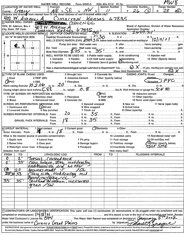 Osborn 66 | 35 ft. | 29.9 ft. | Monitoring well/observation/piezometer | MW 8 | Constructed | 18-Dec-2001 | Scan | |