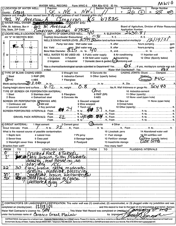 Osborn 66 | 40 ft. | 30.99 ft. | Monitoring well/observation/piezometer | MW 10 | Constructed | 18-Dec-2001 | Scan | |