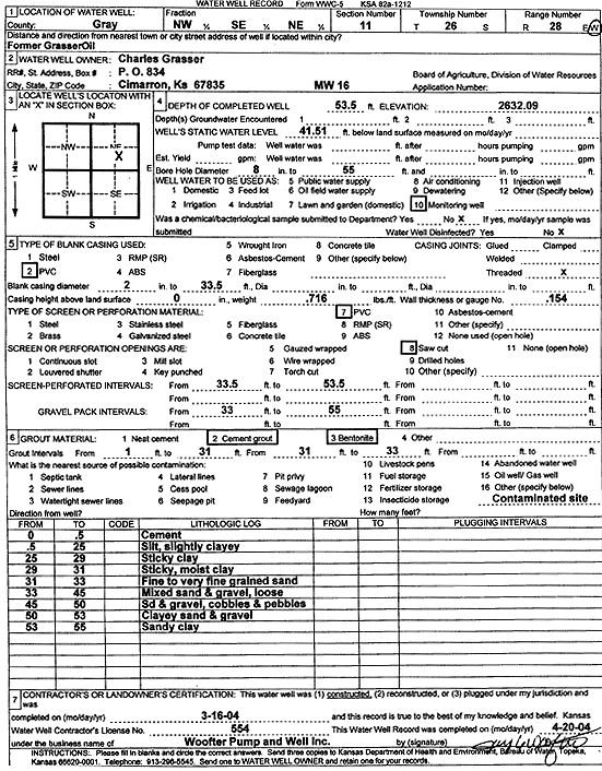 Grasser, Charles | 53.5 ft. | 41.51 ft. | Monitoring well/observation/piezometer | MW 16 | Constructed | 16-Mar-2004 | Scan | |