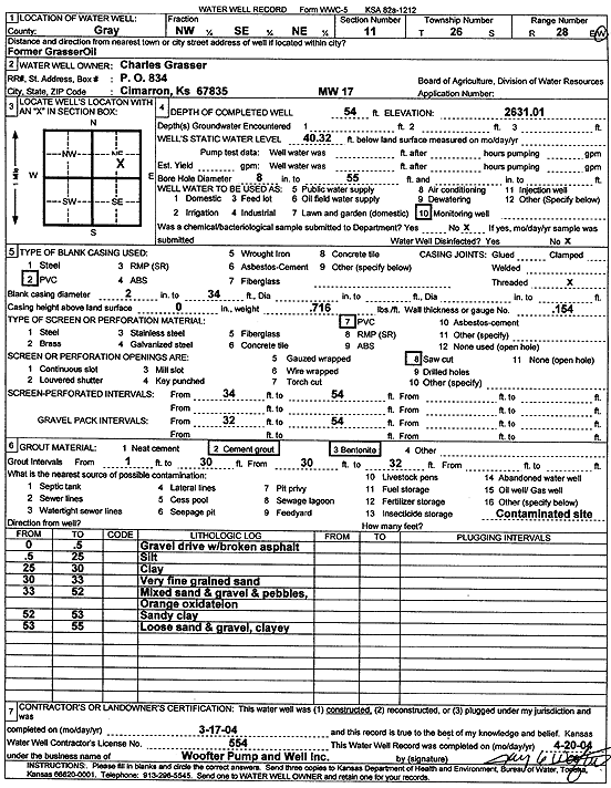 Grasser, Charles | 54 ft. | 40.32 ft. | Monitoring well/observation/piezometer | MW 17 | Constructed | 17-Mar-2004 | Scan | |
