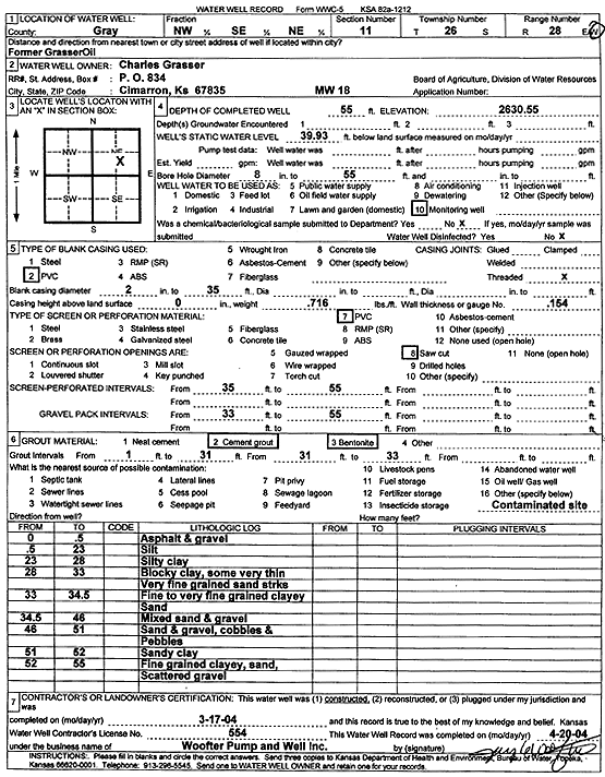 Grasser, Charles | 55 ft. | 39.93 ft. | Monitoring well/observation/piezometer | MW 18 | Constructed | 17-Mar-2004 | Scan | |