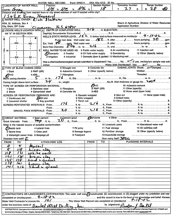Blattner, Rick | 216 ft. | 152 ft. | 40 gpm. | Domestic | Constructed | 18-Sep-2002 | Scan | |