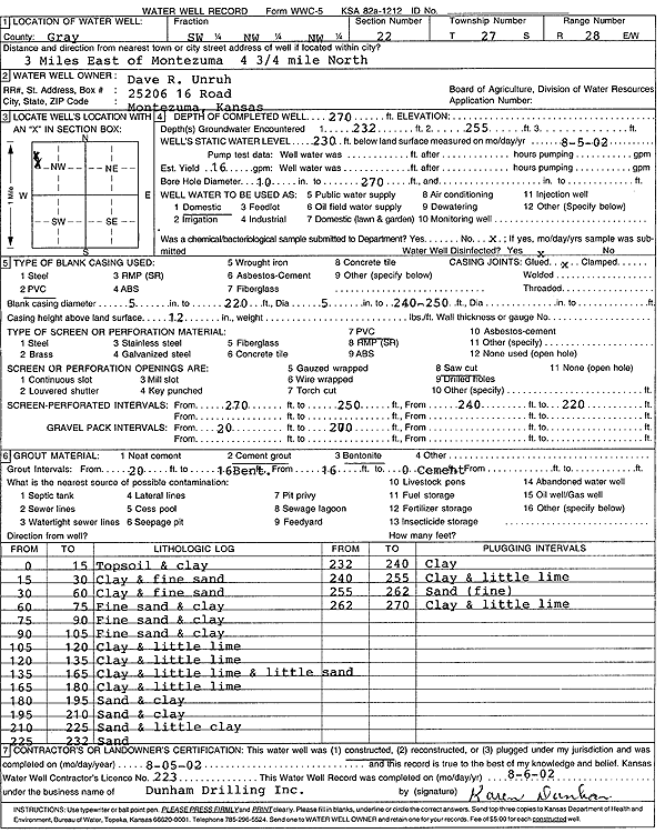 Unruh, Dave R. | 270 ft. | 230 ft. | 16 gpm. | Domestic | Constructed | 05-Aug-2002 | Scan | |