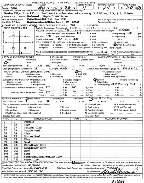 Wehkamp, Jim | 235 ft. | 142 ft. | Irrigation | Plugged | 16-Mar-1992 | |||
