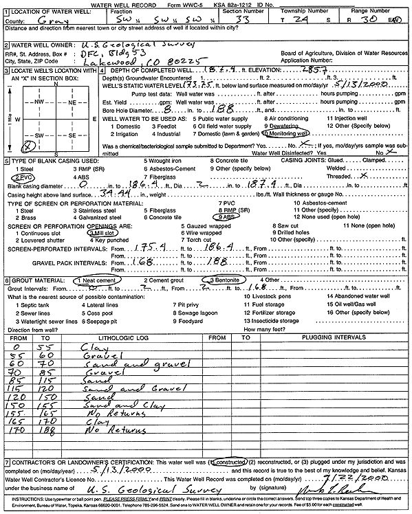 U.S. Geological Survey | 187 ft. | 175.7 ft. | Monitoring well/observation/piezometer | Constructed | 13-May-2000 | Scan | ||