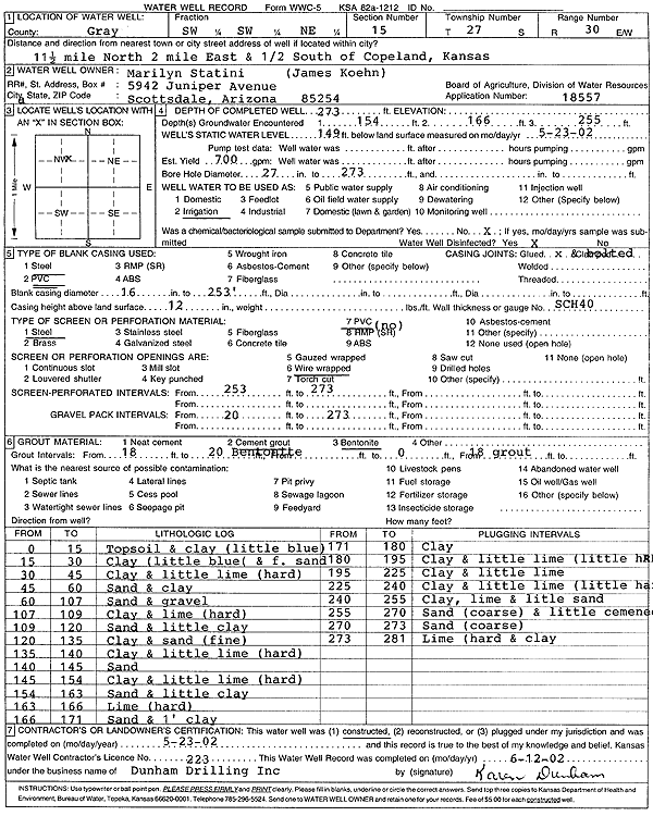 Koehn, Wilbur | 200 ft. | 82 ft. | 80 gpm. | Domestic | Constructed | 11-May-1976 | ||