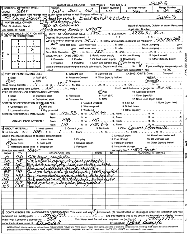 City of Montezuma | 135 ft. | 115.11 ft. | Monitoring well/observation/piezometer | SWP 3 | Constructed | 16-Jul-1999 | Scan | |