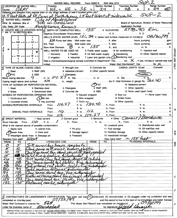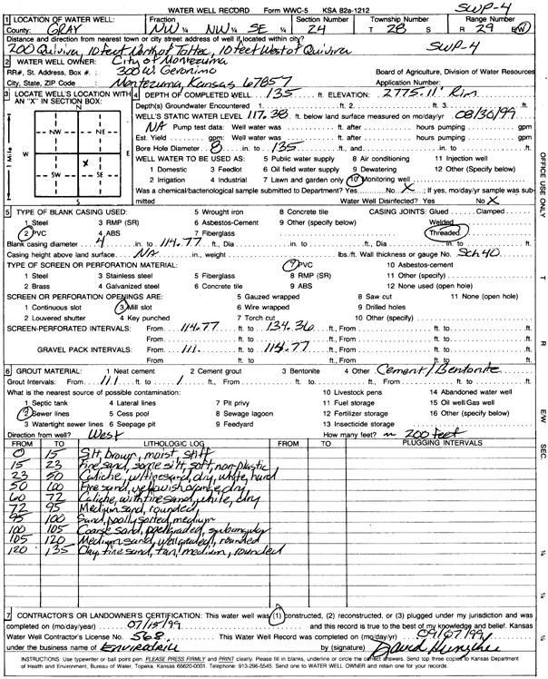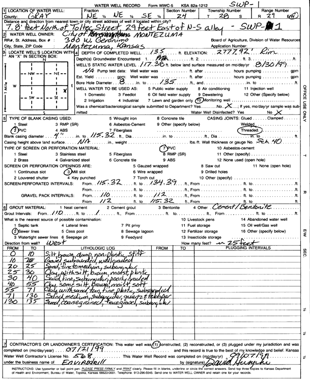 City of Montezuma | 135 ft. | 117.38 ft. | Monitoring well/observation/piezometer | SWP 1 | Constructed | 21-Jul-1999 | Scan | |