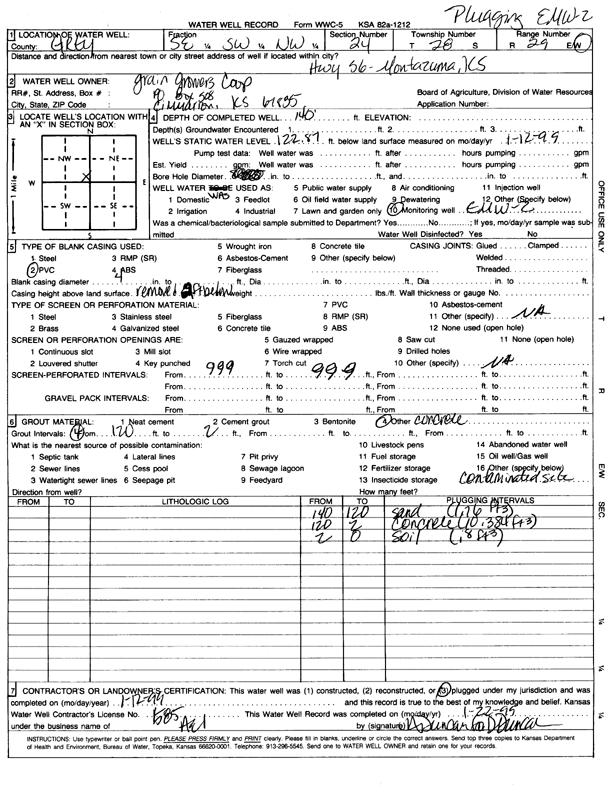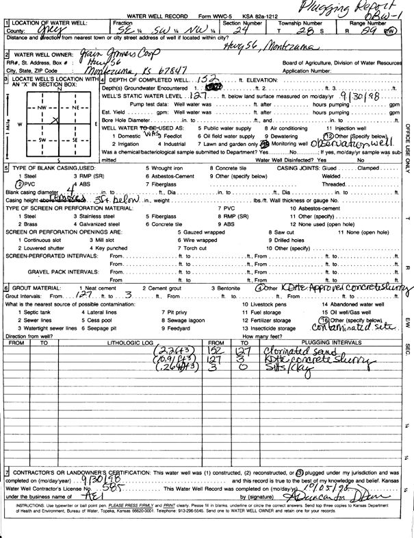 KDHE/Montezuma Cooperative | 145 ft. | 125 ft. | 1 gpm. | Monitoring well/observation/piezometer | Constructed | 18-Sep-1991 | ||