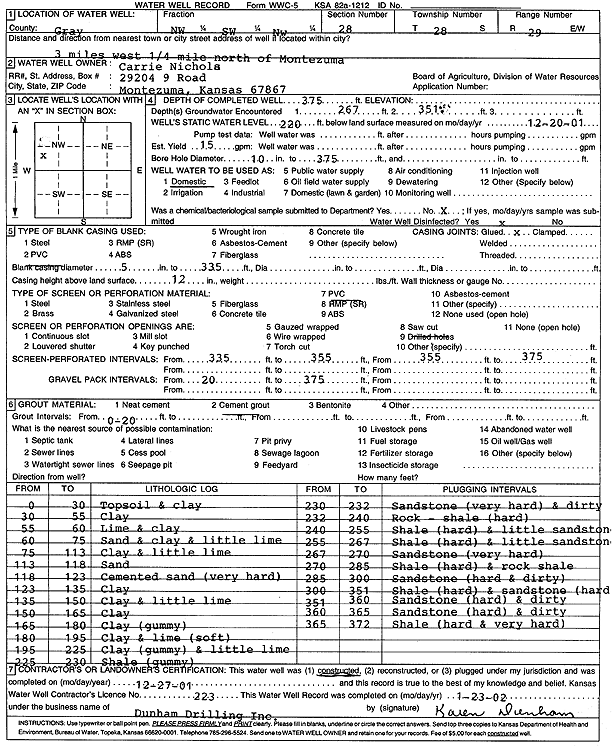 Nichols, Carrie | 375 ft. | 220 ft. | 15 gpm. | Domestic | Constructed | 27-Dec-2001 | Scan | |