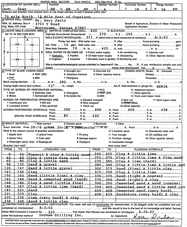 Jantz, Gary | 420 ft. | 311 ft. | 16 gpm. | Domestic | Constructed | 02-Aug-2002 | Scan | |
