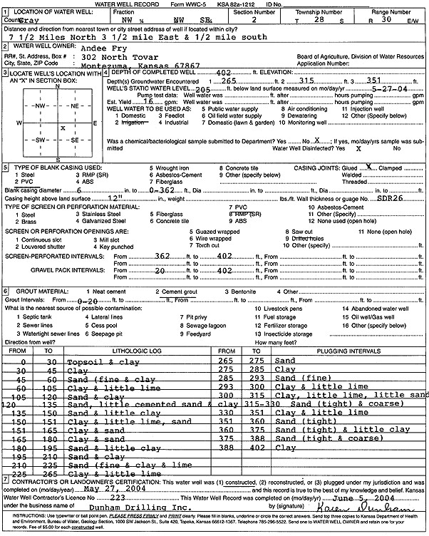 Fry, Andee | 402 ft. | 205 ft. | 16 gpm. | Domestic | Constructed | 27-May-2004 | Scan | |