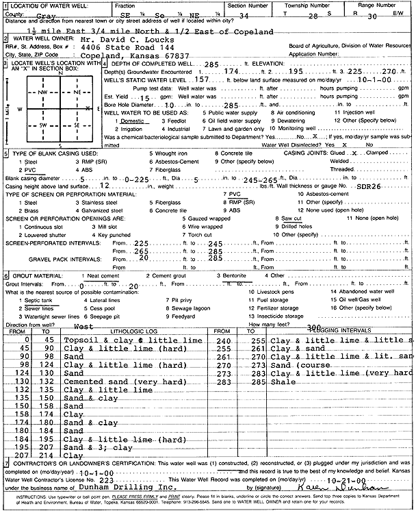 Loucks, David C | 285 ft. | 157 ft. | 15 gpm. | Domestic | Constructed | 01-Oct-2000 | Scan | |