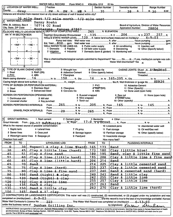Koehn, Danny | 265 ft. | 120 ft. | 800 gpm. | Irrigation | Constructed | 09-Jun-2003 | Scan | |