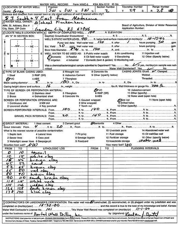 Plankenhorn, Michael | 140 ft. | 90 ft. | 20 gpm. | Domestic | Constructed | 30-Oct-2000 | Scan | |