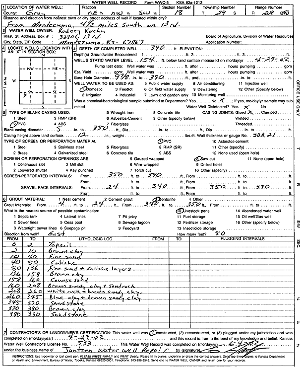Huelskamp, Leroy | 285 ft. | 120 ft. | 20 gpm. | Domestic | Constructed | 23-Mar-2011 | ||