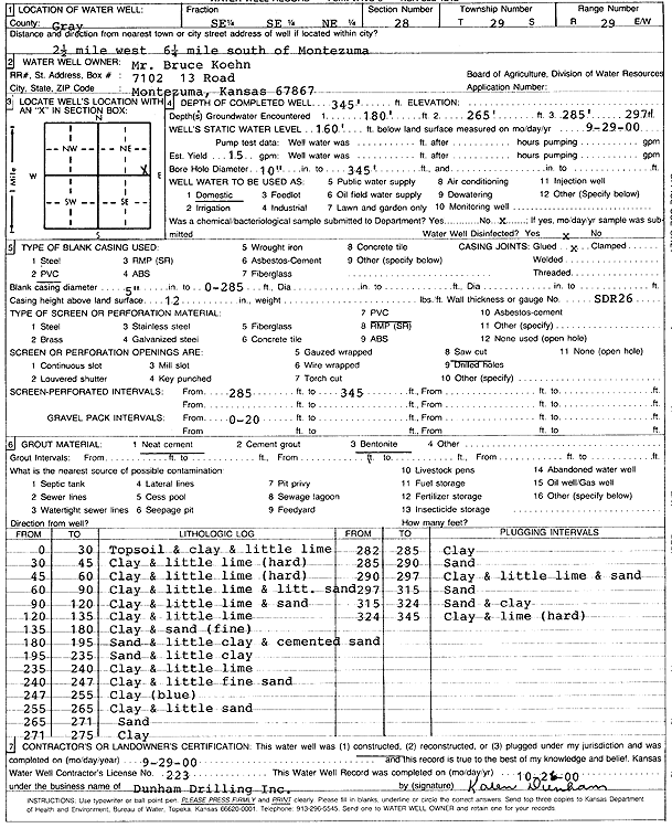 Koehn, Bruce | 345 ft. | 160 ft. | 15 gpm. | Domestic | Constructed | 29-Sep-2000 | Scan | |