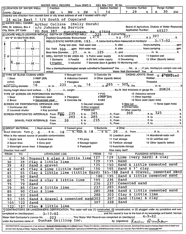 Collins, Arthur | 325 ft. | 193 ft. | 700 gpm. | Irrigation | Constructed | 17-Mar-2002 | Scan | |