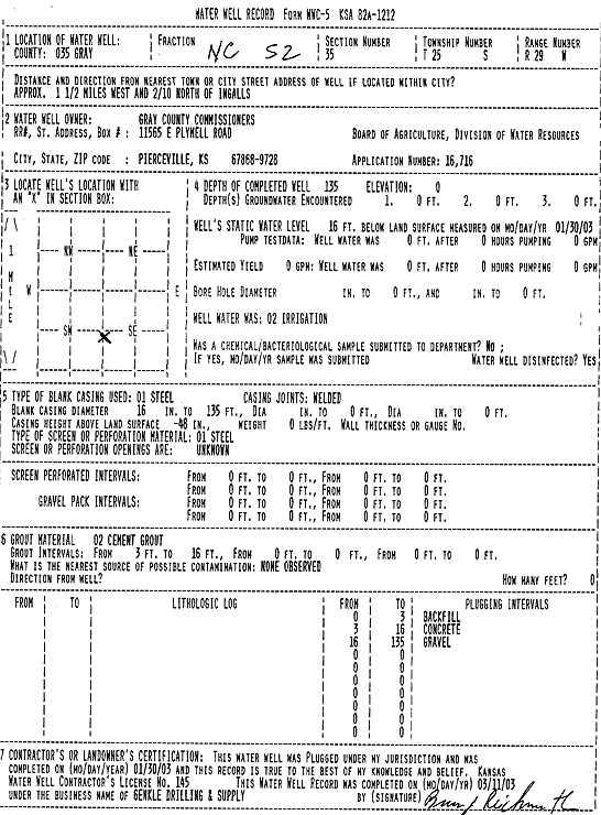 Gray County Commissioners | 135 ft. | 16 ft. | Irrigation | Plugged | 30-Jan-2003 | Scan | ||