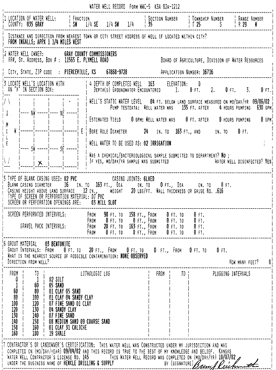 Gray County Commissioners | 163 ft. | 84 ft. | Irrigation | Constructed | 04-Sep-2002 | Scan | ||