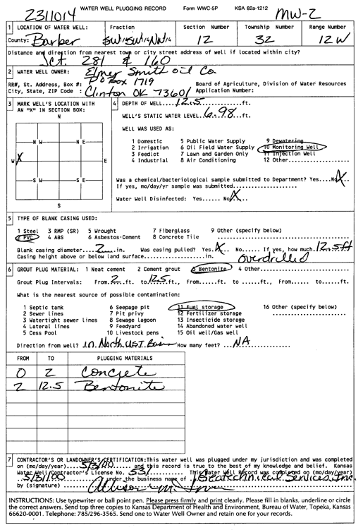 Elmer Smith Oil Co. | 12.5 ft. | 6.98 ft. | Monitoring well/observation/piezometer | MW 2 | Plugged | 03-May-2000 | Scan | |