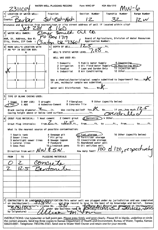 Elmer Smith Oil Co. | 12.5 ft. | 7.08 ft. | Monitoring well/observation/piezometer | MW 6 | Plugged | 03-May-2000 | Scan | |