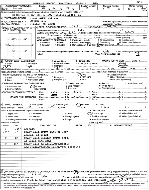 Elmer Smith Oil Co. | 14 ft. | 6.35 ft. | Monitoring well/observation/piezometer | MW 3 | Plugged | 03-May-2000 | Scan | |