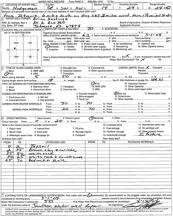 Kansas Corporation Commission Dist. 1 | 61 ft. | 43.5 ft. | Monitoring well/observation/piezometer | Constructed | 12-Nov-2002 | Scan | ||