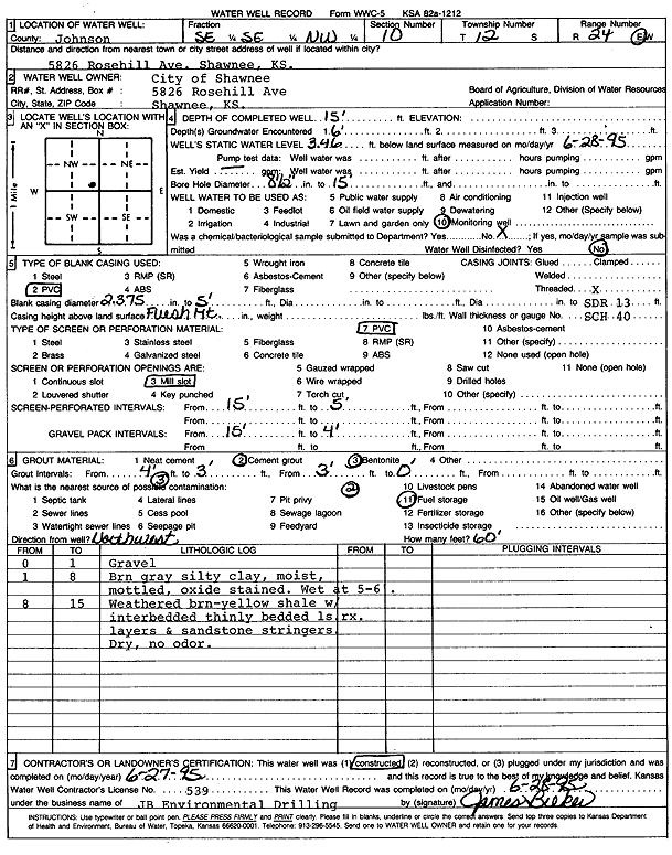 City of Shawnee | 15 ft. | 3.46 ft. | Monitoring well/observation/piezometer | Constructed | 27-Jun-1995 | Scan | ||