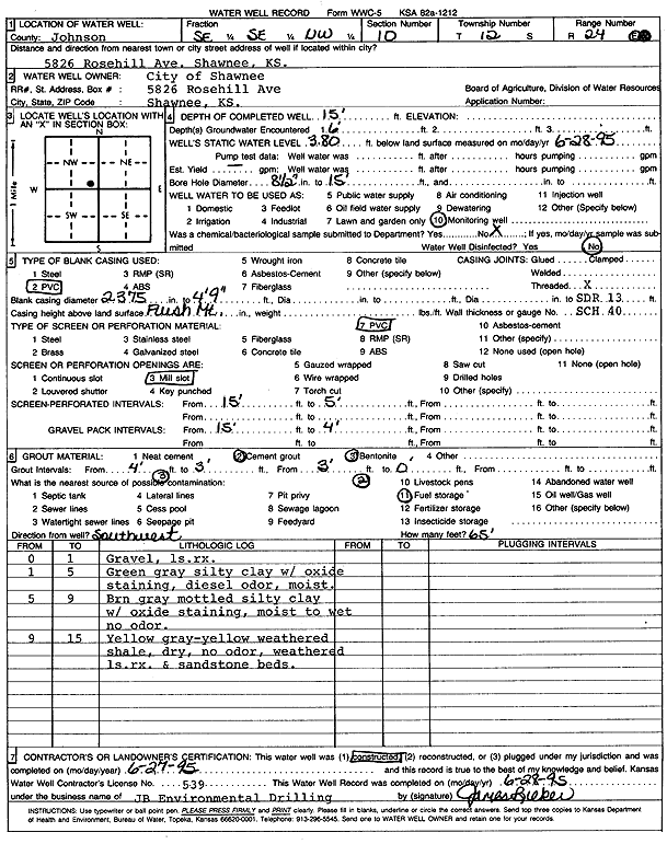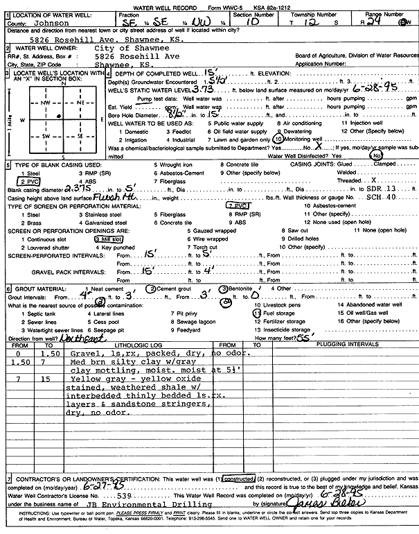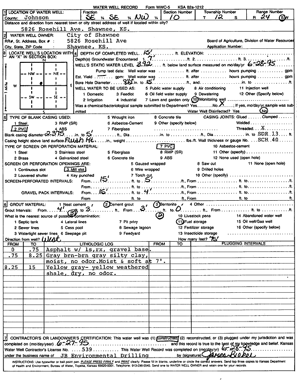 City of Shawnee | 15 ft. | 3.92 ft. | Monitoring well/observation/piezometer | Constructed | 27-Jun-1995 | Scan | ||
