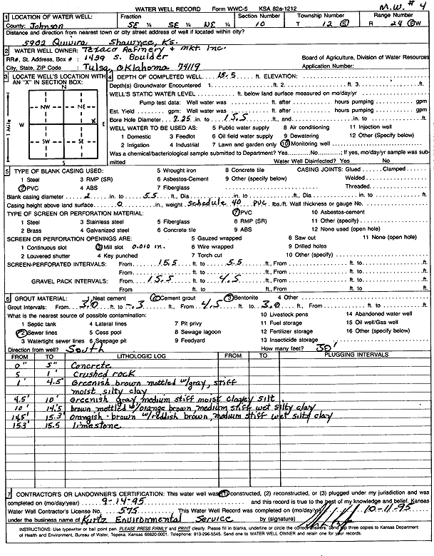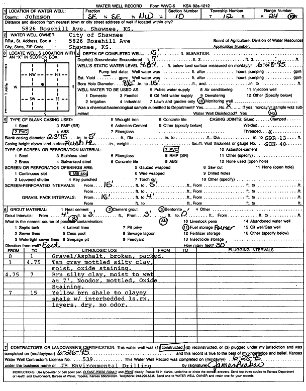 City of Shawnee | 15 ft. | 4.64 ft. | Monitoring well/observation/piezometer | Constructed | 26-Jun-1995 | Scan | ||