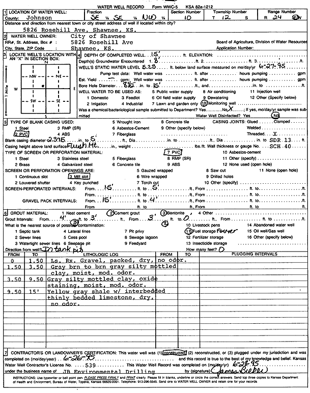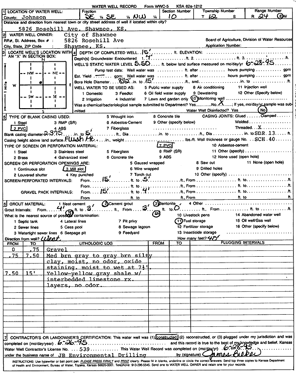 City of Shawnee | 15 ft. | 5.5 ft. | Monitoring well/observation/piezometer | Constructed | 26-Jun-1995 | Scan | ||