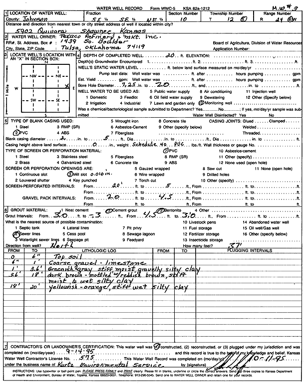 Texaco Refining and Marketing, Inc | 20 ft. | Monitoring well/observation/piezometer | MW 3 | Constructed | 14-Sep-1995 | Scan | ||