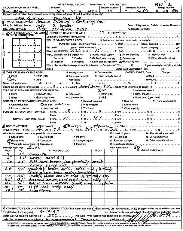 Texaco Refining and Marketing, Inc | 15 ft. | Monitoring well/observation/piezometer | MW 2 | Constructed | 14-Sep-1995 | Scan | ||