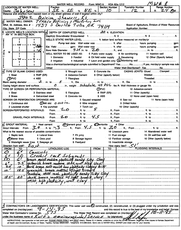 Texaco Refining and Marketing, Inc | 20 ft. | Monitoring well/observation/piezometer | MW 1 | Constructed | 14-Sep-1995 | Scan | ||