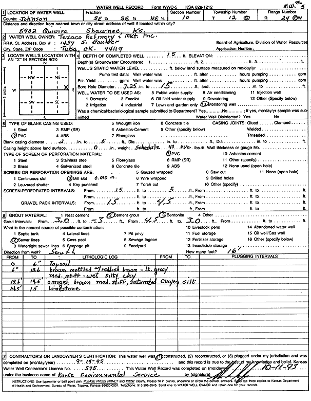 Texaco Refining and Marketing, Inc. | 15 ft. | Monitoring well/observation/piezometer | MW 5 | Constructed | 14-Sep-1995 | Scan | ||