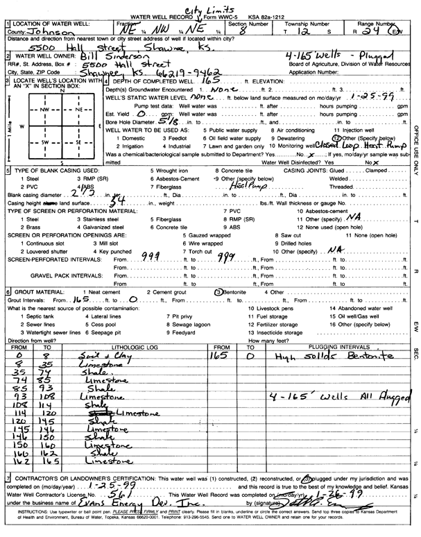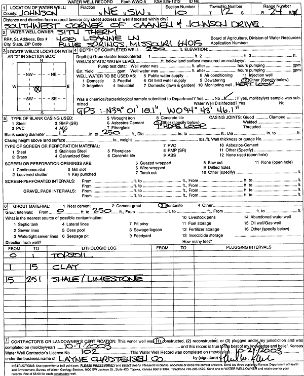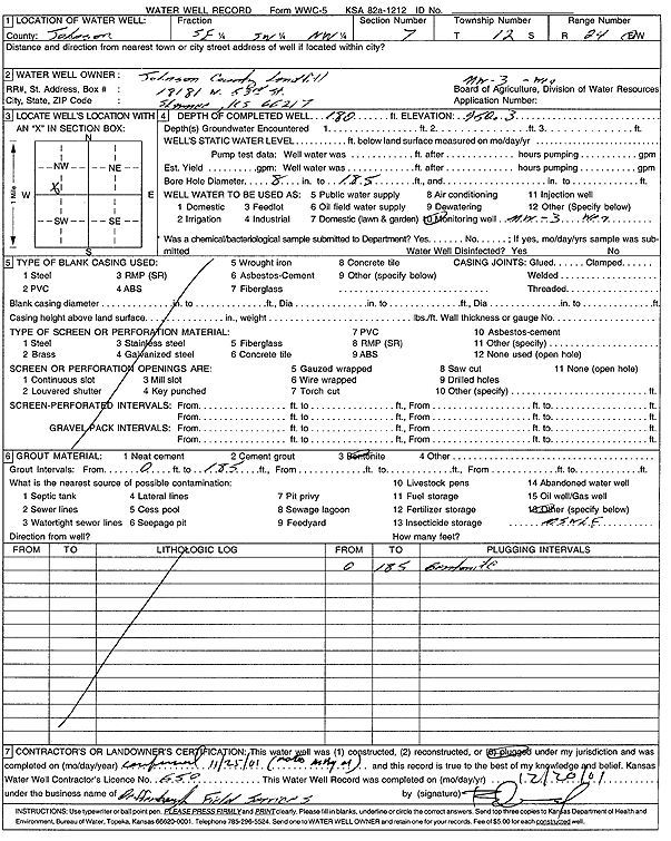 Johnson County Landfill | 180 ft. | Monitoring well/observation/piezometer | MW 3 | Plugged | 25-Nov-2001 | Scan | ||