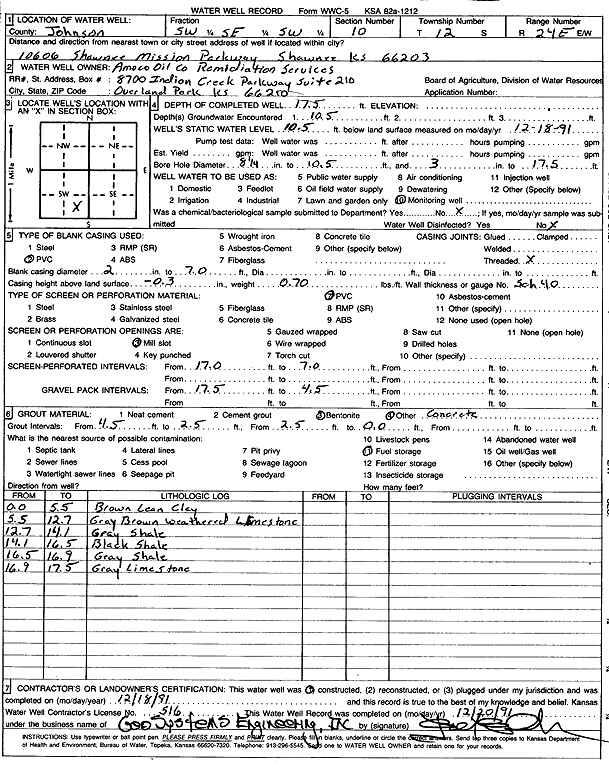 Amoco Oil Co. | 17.5 ft. | 10.5 ft. | Monitoring well/observation/piezometer | Constructed | 18-Dec-1991 | Scan | ||