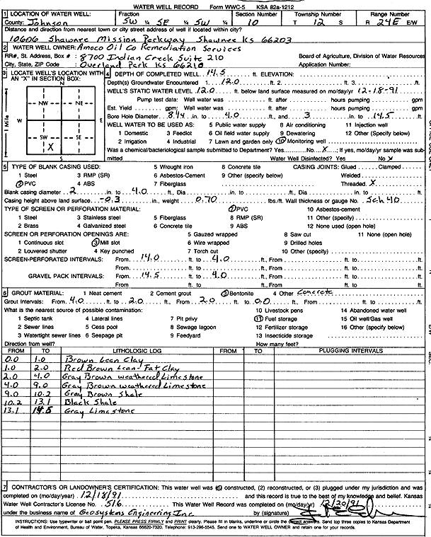 Amoco Oil Co. | 14 ft. | 12 ft. | Monitoring well/observation/piezometer | Constructed | 18-Dec-1991 | Scan | ||